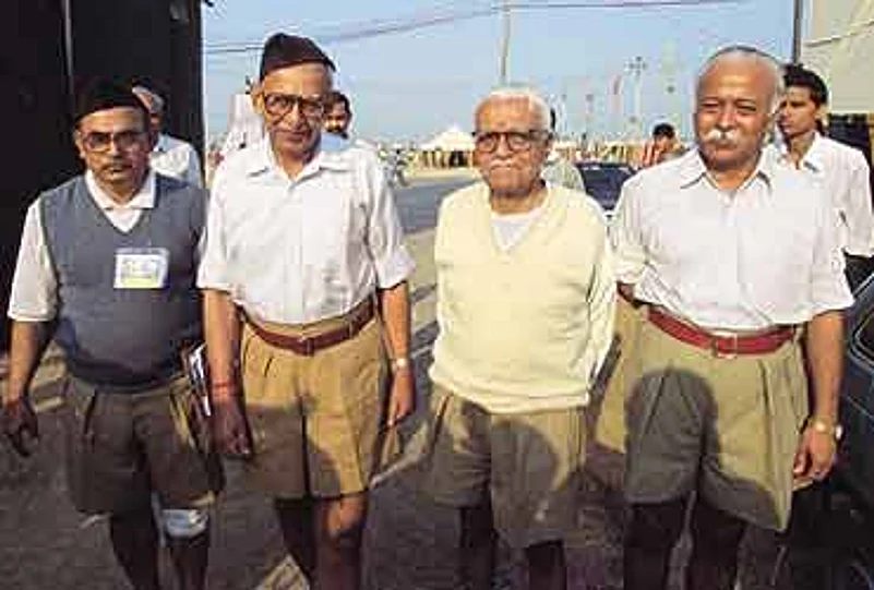 Given the closely enmeshed BJP-RSS relations, partymen have been compelled to adopt duplicitious positions. Take the utterances of Sushma Swaraj last week. She calmly told journalists that "no one ever asked Advani for his resignation", then avoided stating clearly whether she expected the loh purush to complete his term as president. The next day, without checking with Advani, she took the initiative of attacking NDA convenor George Fernandes for "crossing his jurisdiction" (he had asked the RSS to confine itself to socio-cultural matters and not interfere in politics).