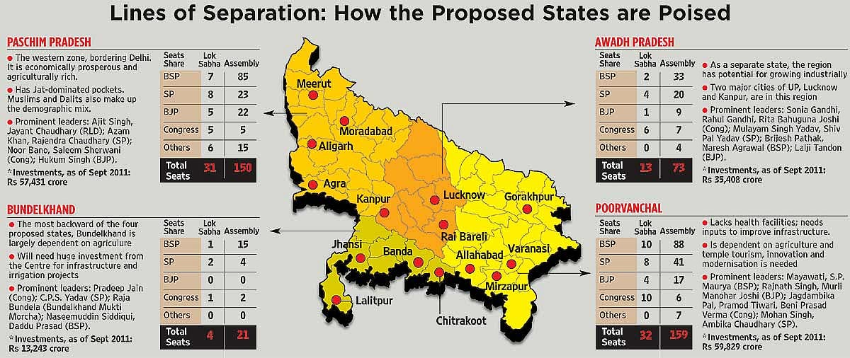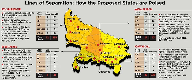 The road to New Delhi, so goes the cliche, passes through Uttar Pradesh, which sends as many as 80 MPs to the Lok Sabha, the most among the states in the country. But that route is likely to get complicated—and some day soon—for Uttar Pradesh chief minister Mayawati has proposed dividing the state into four. Her cabinet has already adopted a resolution on doing so and, as early as November 21, the state assembly is likely to follow suit, effectively putting in a bind the Congress-led UPA government at the Centre. The state goes to elections next year, and this sudden manoeuvre—her rival parties, which are trying to corner her on corruption and misgovernance, call it a diversionary tactic—is a challenge to the national parties, particularly the Congress. The Congress cannot be seen as opposing the move, but how can it swiftly clear the creation of four states when it hasn’t been able to decide yet on Telangana, an issue dividing its MPs and MLAs from the region? And what of the demand for Vidarbha in Maharashtra? In Uttar Pradesh, there has been no consistent call for new states save for the ‘Jat belt’ in the west and Bundelkhand. (The latter, anyway, is complicated by the fact that locals see Bundelkhand as a region extending into neighbouring Madhya Pradesh too.)