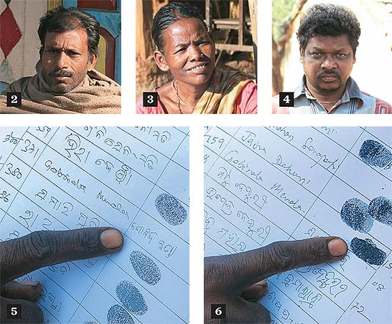 2. Triple Entry Baidyanath Sahoo’s name apprears thrice in the resolutions; 3. Why Insult Us? Masuri Behra says, “Why kick us in the stomach?”; 4. Lied About Ex-sarpanch Gopal Munda says he never held the meetings; 5 & 6. Double Entry Gobinda Munda’s name figures twice. (Photograph by Chitrangada Choudhury)