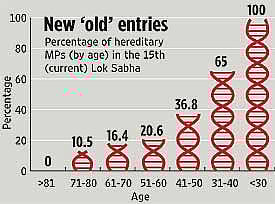 I asked Kaul to look at the MPs who had multiple family links. He responded, “The problem is the sample size: it is 27. As a rule, one does not consider stats run on sample sizes less than 30 to have any statistical meaning.” I promised to bear this in mind, and not to look at the data in percentage terms. The 27 hyperhereditary MPs were concentrated in certain states: Uttar Pradesh, Andhra Pradesh, Haryana and Punjab in particular. Again, their age distinguished them.