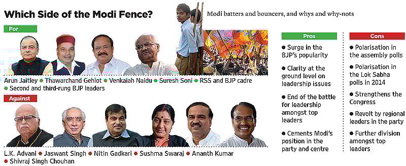 If the decision isn’t forced, Modi will most likely have to wait till December when the BJP’s scorecard becomes clearer post the state polls. Right now, regional leaders are openly resisting Modi’s intervention in their election campaigns (with Madhya Pradesh CM Shivraj Singh Chouhan refusing to include him even in publicity material) and insisting they’re in a position to lead their respective platoons into battle on their own. Others like Shatrughan Sinha and Jaswant Singh have also expressed reservations, with Jaswant even insisting that the PM candidate be announced only after the polls.