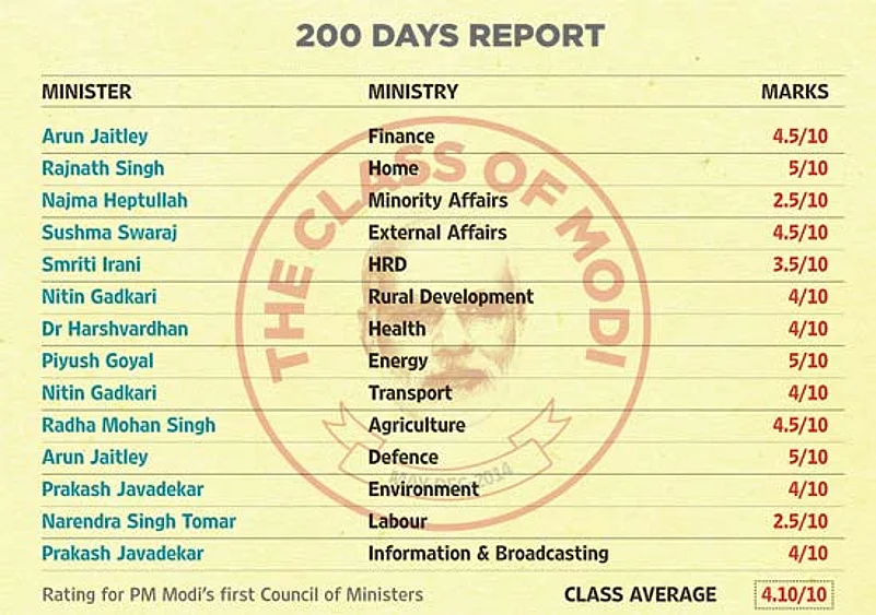 Our rating of 14 key ministries* shows the enormous gap between hype-related slogans and reality. Our ministers barely get pass marks for this 200-day period. It is disturbing, and also a reminder of the massive challenges ahead. What makes this marker interesting is that there is also the first glimmer of open impatience from commentators and supporters who have until now been fervent supporters of Modi’s rise. Asked recently to comment on the performance of NDA-II, ex-Union minister Arun Shourie quipped, “When all is said and done, more is said than done” and went on to quote Akbar Allahabadi, “Plateon ke aane ki awaaz to aa rahi hai lekin khana nahin aa raha (We can hear the plates rattling but there is still no sign of food).”