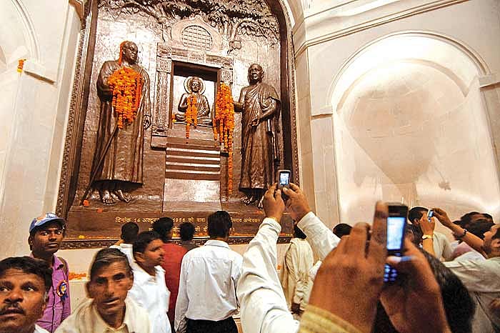 In Maharashtra households, as Y.S. Alone, an assistant professor at JNU, tells us, “it’s not uncommon to hear ditties woven around Ambedkar being sung even now—Andherya vastita Bhimanna lavalay diva (In darkness, Bhimanna has lit a lamp) or Uddharli koti kule, bhima thujya janmamoole (Because of your birth, many families blossomed, O Bhim’).” There are also those who accept nuance. Gopal Guru, a professor at JNU, says, “Common Dalits, involved in everyday acts of resistance and assertion, don’t treat Babasaheb as a god. They treat him as an exemplar, whose teachings have to be critically followed. But there is a section of activists who make him out to be a god.”