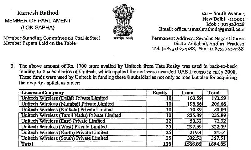It is believed that Unitech served as a front for the Tata group when they were “desperate” for a GSM license and spectrum. Ramesh Rathod, the Telugu Desam Party MP from Adilabad, points out in the January 11, 2011, letter that the Tata group “funded the entire amount of Rs 1,700 crore paid by the Unitech group for acquiring” 2G spectrum. He also alleges that the “deal was brokered by Niira Radia” who had both the “Tata group and Unitech group as her clients”. (The Radia tapes had given indications on this earlier—that she played a key role in some of the repayments from Unitech to Tata Realty.)