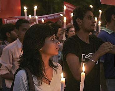 Delhi citizens participate in a candle light vigil in the memory of people killed during Saturday Sept 13 serial bomb blasts
