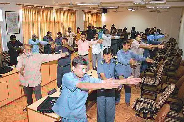 The teacher stalks up and down the front row of the class. “Tanaav ka kuch kaaran bataiye”—please list the causes of stress— she says, in a voice ringing with authority. “Long hours? Pressure from family? Alcohol abuse? What makes you tense?” she hurls the questions in Hindi, pausing before a man with vividly hennaed hair, and examines his notes gravely. Someone at safe wisecracking distance from the back of the class whispers a loud stage aside—“Tanaav nahi hai, bhook hai!” (we’re not tense, we’re hungry).