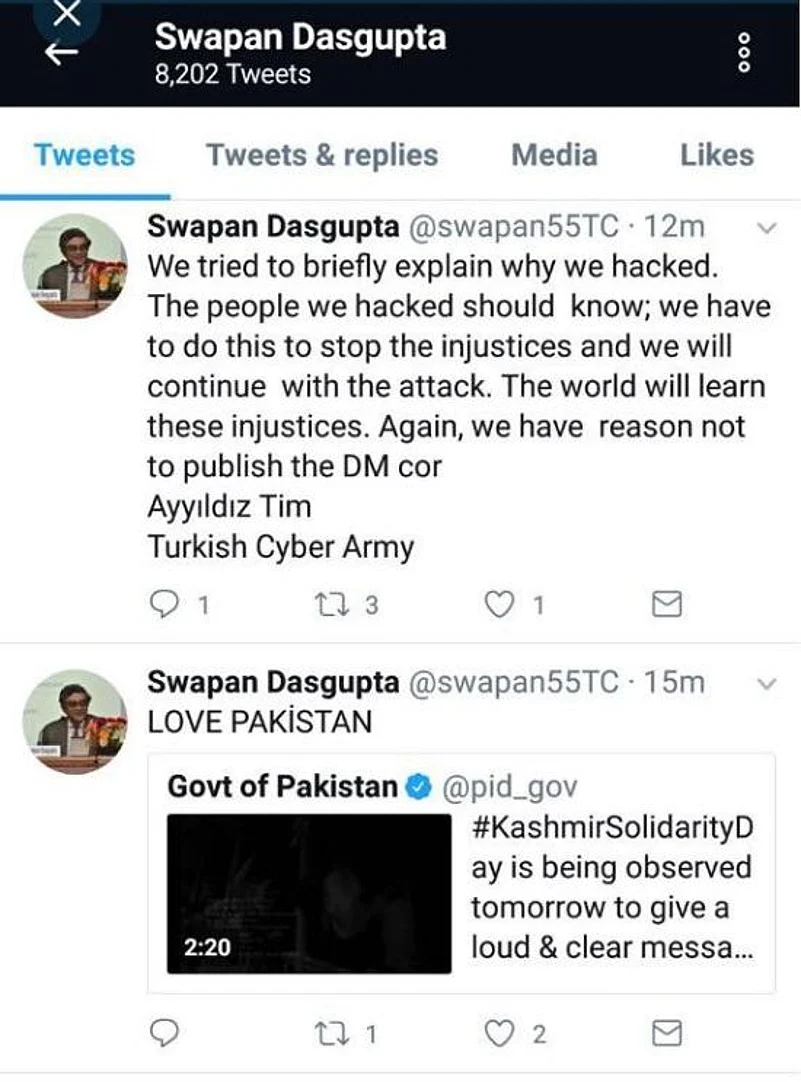 "Hello there! I want to introduce ourselves first. In 2002, the Republic of Turkey to protect it from cyber attacks and to combat terrorist organisations were founded. Turkey's first cyber army of. We have 300,000s (sic)", read a pinned tweet on Swapan Dasgupta's handle