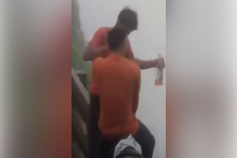 The video which is circulating on social media shows the two men, bottles in hand, climbing the fence around the edge of the valley and backtracking once or twice. Then the two are seen standing on the edge, beyond the fence, and slipping down.