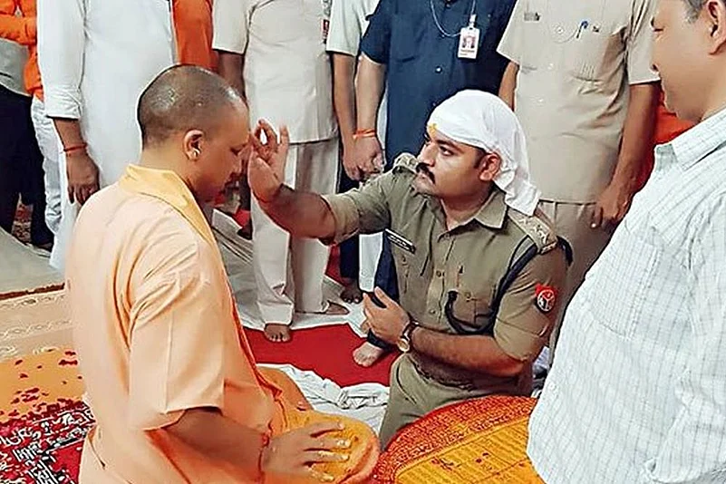 A police officer in Uttar Pradesh’s Gorakhpur whose photographs showed him kneeling down at the Chief Minister's feet with folded hands, said he did so to take the blessings of Peethadishwar Mahant Yogi Adityanath.