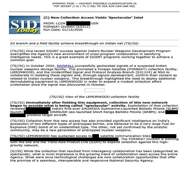 The Intercept reported that an NSA site in Australia had geolocated signals of a suspected Indian nuclear weapons storage facility. After that another site based in Thailand isolated these signals to find that it was related to Indian nuclear weapons. The analysis of these inputs led to the discovery that India was working on Sagarika and Dhanush. The NSA, The Intercept article claimed, also found out about a pilotless target aircraft project and two unidentified bombs.