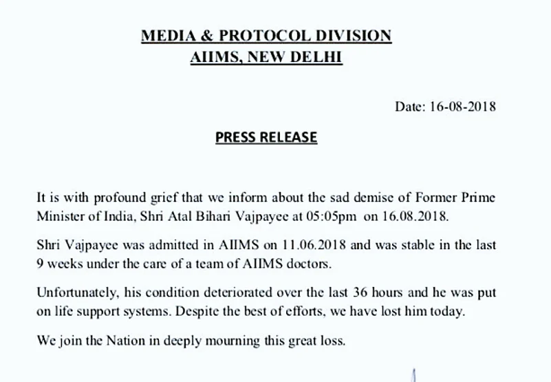 In a statement, AIIMS said that former prime minister Atal Bihar Vajpayee passed away at 5.05 pm on Thursday.