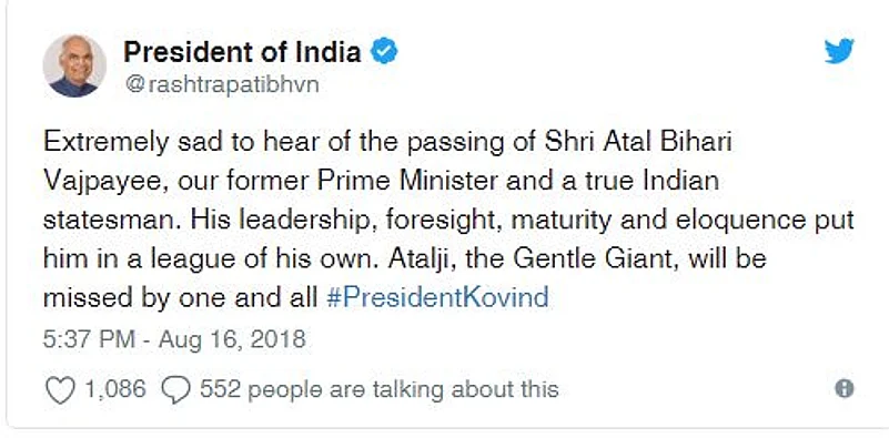 President Ramnath Kovind has expressed grief over Vajpayee's death.