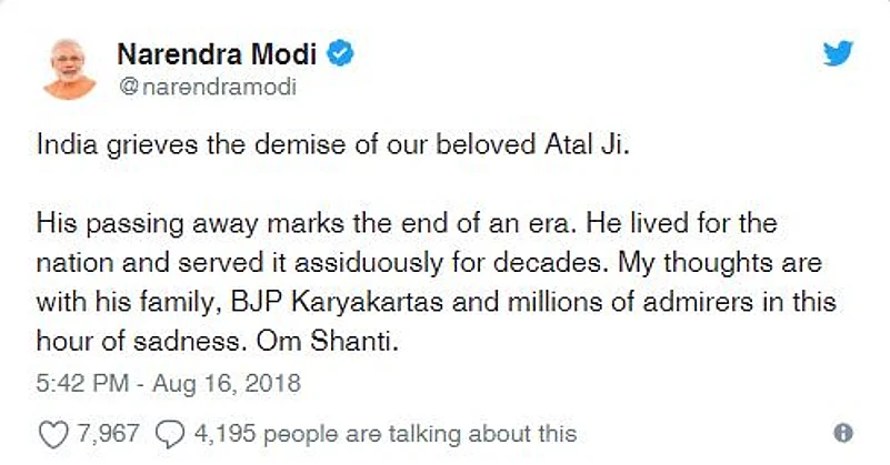 Prime minister Modi calls Vajpayee's demise "end of an era".