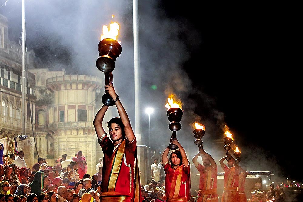 On a November evening, the ghats of Varanasi are peopled by a motley bunch—single folk and couples, young and old, locals and foreigners, people aspiring for moksha and college students—a bustle of life removed from their death-haunted ethos. Men poised on podiums perform aarti, hymns from loudspeakers aiding the performance. Boats glide on the darkening waters of the Ganga, lit up occasionally by the firing of flashes from phone cameras. One wonders if the eyes of the faithful imbue the spectacle with spiritual significance.