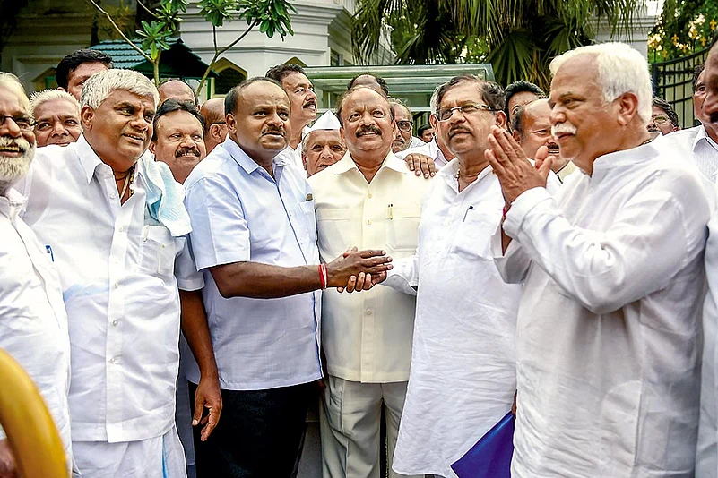 Here’s the story so far: Raj Bhavan has given the BJP 15 days to prove it has a majority—the party has only 104 seats out of 222 seats where elections were held. So, the thorny path ahead, as previous experiments with hung assemblies suggest, is strewn with the possibilities of ‘resort politics’, constitutional conundrums and ‘Operation Lotus’, which is the local slang for engineering defections. The JD(S)-Congress combine, which is safely over the halfway mark with 117 seats and has staked claim to form a government, is fuming. The battle for Karnataka is wide open and turning nasty.
