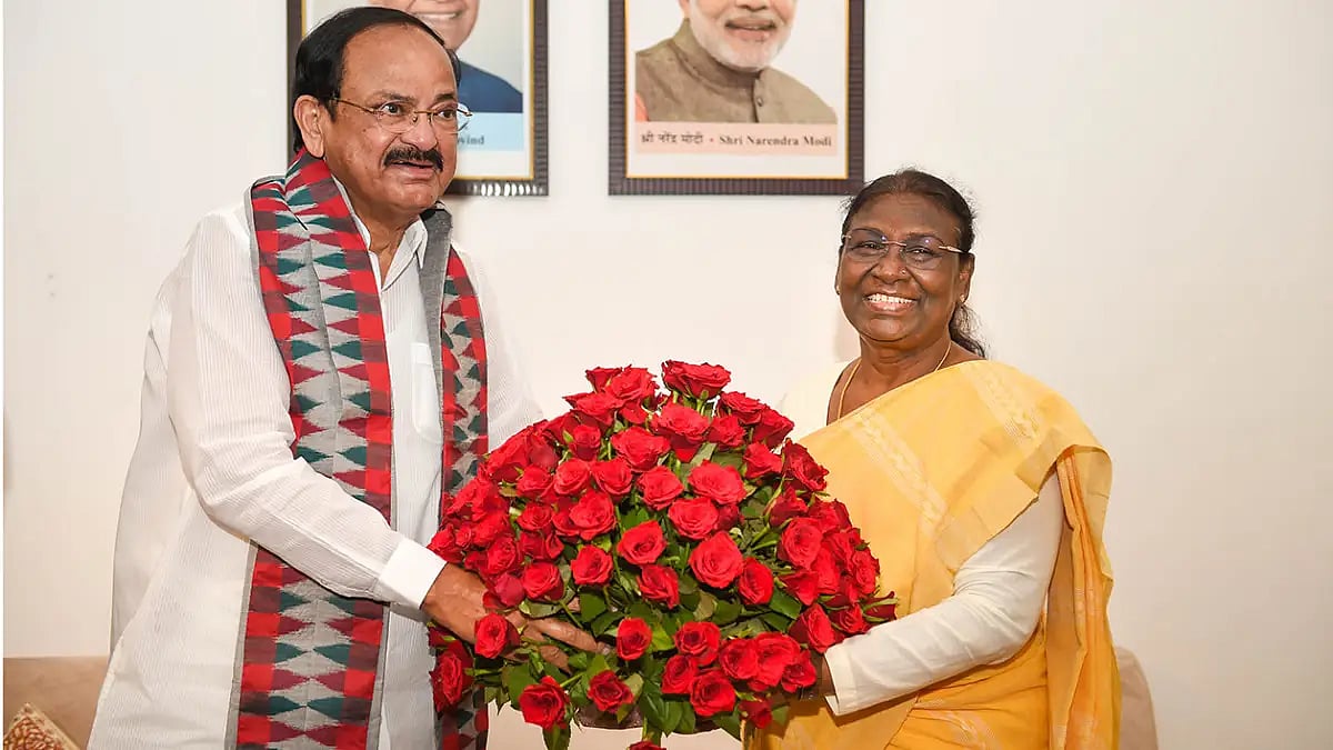 Vice President M Venkaiah Naidu visited Droupadi Murmu's temporary residence here on Friday and congratulated her on being elected as the 15th president of India.