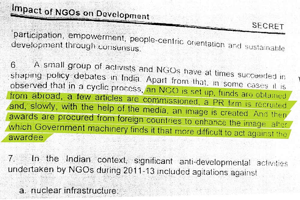 The passage lifted by IB reads, “...In some cases, it is observed that in a cyclic process, an NGO is set up, funds are obtained from abroad, a few articles are commissioned, a PR firm is recruited and slowly, with the help of media, an image is created. And then awards are procured from foreign countries to enhance the image, after which the government machinery finds it that more difficult to act against the awardee (sic).”