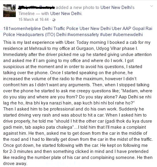 Through her Facebook post, she has accused a Uber driver of harassing her inside the cab while going from Mehrauli to Gurgaon.