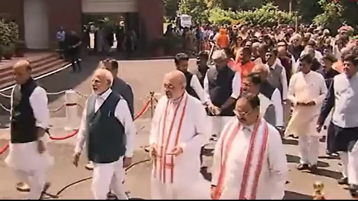 PM Modi was joined by Defence Minister Rajnath Singh, Home Minister Amit Shah and BJP chief JP Nadda as they walked from the old Parliament building to the new one. They were followed by the NDA MPs who raised slogans such as 'Bharat Mata ki Jai' and 'Vande Matram'.
