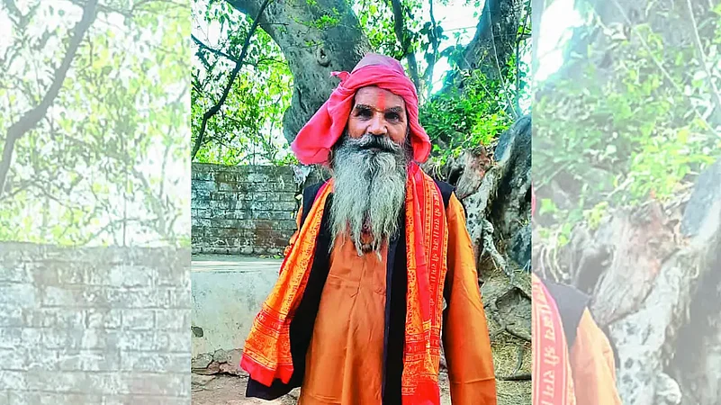 A resident of Basti district in Uttar Pradesh, Sitaram took a pledge to remain unmarried in his 20s and spent some years at the Ram temple in Ayodhya. After a few years, he travelled along the Narmada before settling down near Jogiya pond in Kotmi Sonar. A small Janki temple served as his abode. “I first made friends with two crocodiles in a pond here. Soon, I became friends with all of them,” he tells Outlook. Though he doesn’t belong to any of the Hindu akhadas and crocodiles are his only companions, he soon became the temple’s sole priest.