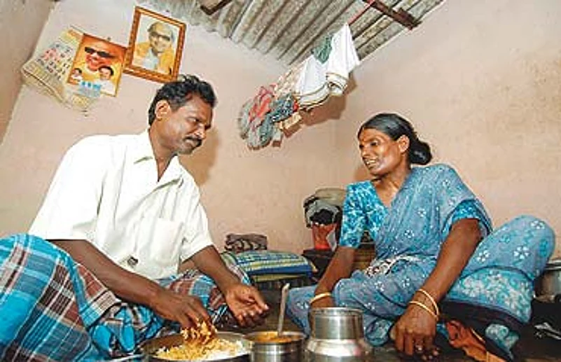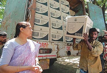 Among the first phase recipients will be Indira and C. Krishnan and their family. They live in one of the temporary asbestos-sheet houses abutting the TN Slum Clearance Board's tenements in Chennai's Kotturpuram. Indira is looking forward to watching her favourite Sun TV serials and news on her own CTV instead of doing the uninvited guest act at her neighbour's. Indira works as a domestic help and life in her 10x10 feet shack is quite miserable. A 14-inch CTV, she hopes, will add some colour even as it jostles for space with their other assets. After all, the CM has repeatedly stressed that the TV would be "a recreational means for women, enabling them to acquire general knowledge". Perhaps the CTV will make Indira forget her real troubles. It's highly unlikely. There are everyday issues that will crop up unfailingly. "We have no private toilet or bathroom. Every morning, we queue up at the ill-maintained public toilet and pay Rs 2 for the bath and Rs 1 for the toilet." It's been the same for 30 years now.