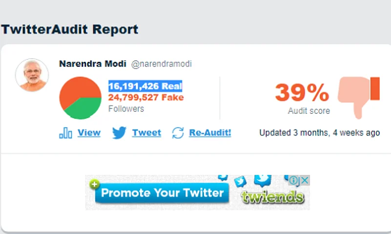 There are sites like Twitter Audit that can parse celebrity numbers for fakes. All one has to do is paste a Twitter handle one wants to ‘audit’ and the site will analyse 5,000 followers to yield the percentage of ‘fakes’. It reads a fake account by the number and frequency of tweets and its own followers—though it can’t tell how many real followers may have signed up but lie dormant.