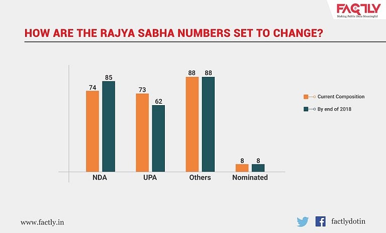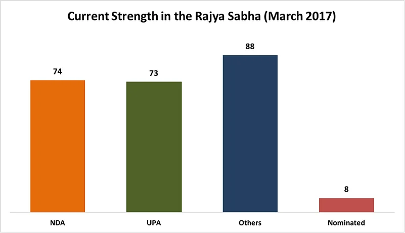 Out of the 243 members of the Rajya Sabha, 73 belong to the UPA, 74 to the NDA, 88 Others and 8 are nominated. The bulk of the others come from the regional parties like SP, BSP, AIADMK, AITC, BJD, JD(U), CPI(M) etc. Though there are 12 nominated members currently serving their term in the Rajya Sabha, four of them joined the BJP and are counted as a part of the BJP’s strength in the house. A nominated member can join a political party within the first six months of being nominated to the house as per the rules.