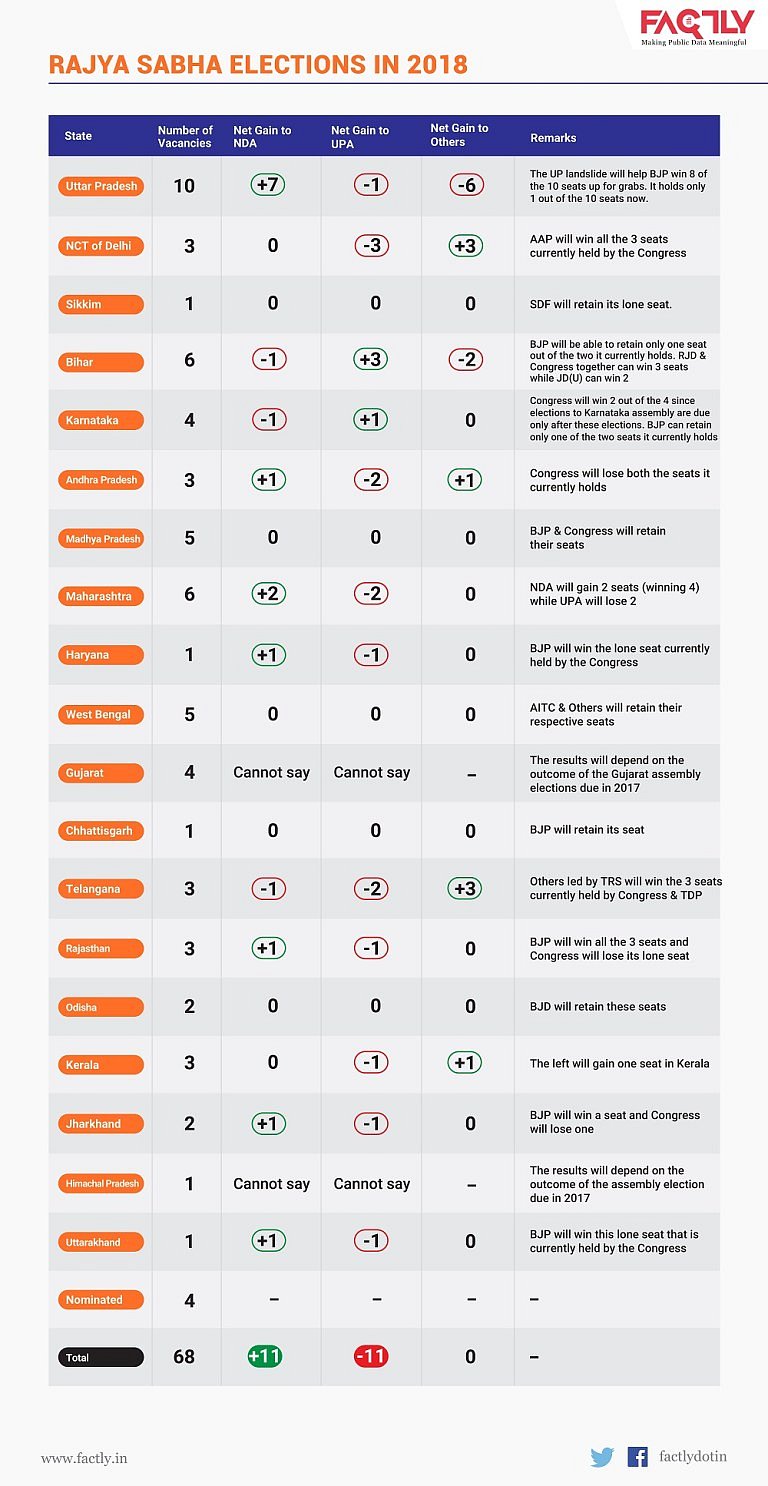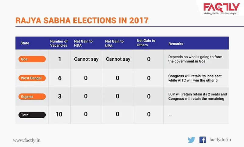 BJP/NDA will not see any net gain in the Rajya Sabha numbers in 2017. Out of the 10 seats on offer, 6 of them are from West Bengal where the BJP/NDA is not in a position to win any. In Gujarat, the BJP will retain its two seats. In Goa, the lone seat will be go to that party which can form the government. Since the BJP currently holds that seat, there will no net gain to the BJP even if it were to form the government and win the seat.