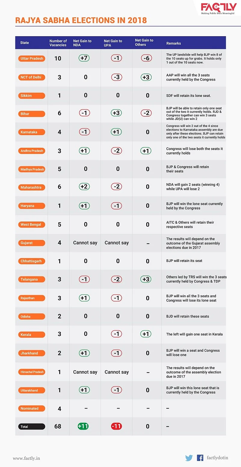 Ten (10) members of the Rajya Sabha will retire in 2017 while 68 members will retire in 2018. Eight (8) members are set to retire in 2019, but none of them will retire before the 2019 general elections to the Lok Sabha. In all, 78 seats of the Rajya Sabha are up for grabs before the 2019 elections. Four (4) of these vacancies will be of the nominated members.