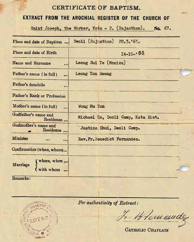 Monica’s baptism certificate. She was baptised in the Deoli camp.