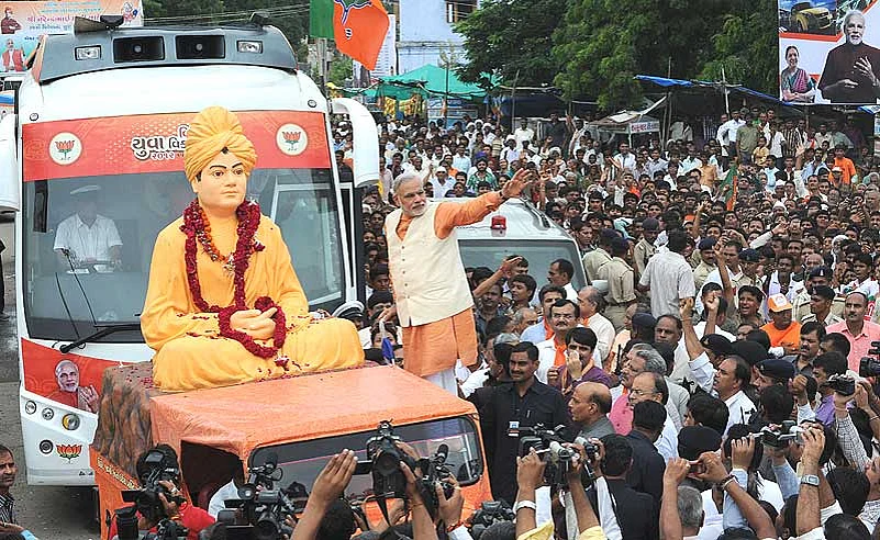 Narendra Modi kicked off a recent rally with a Swami Vivekananda statue adorning his campaign vehicle. A large number of his supporters sported images of Modi and the great seer on their shirts. This symbolic appropriation ought to have embarrassed Modi.