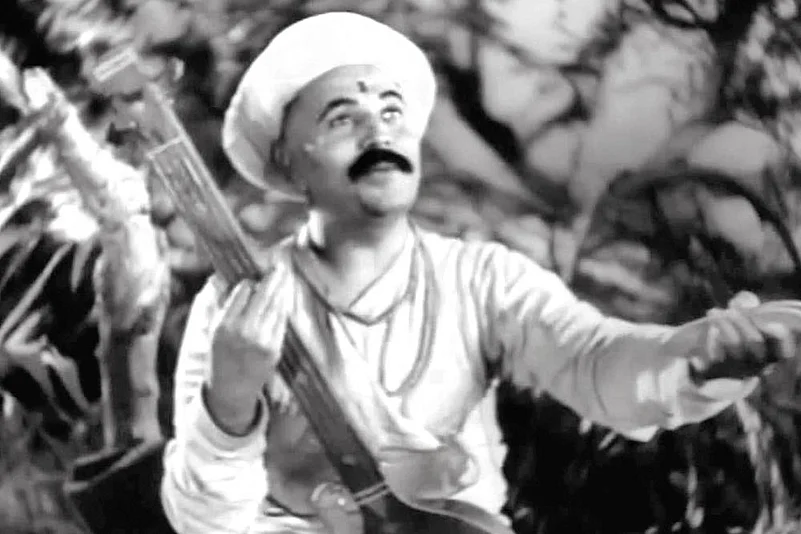 Then there were the devotionals, which took their protagonists from the Bhakti movement who all asserted the freedom to worship one’s own god in one’s own manner. Sant Tukaram (1936), a film by Prabhat Studio about Tukaram, a 17th c saint poet—a Kunbi by caste (an agricultural labouring caste)—dramatises the different attacks on Tuka by the Brahmin head priest even as it simultaneously gestures towards the oppression of the people by the colonial state. This mobilisation of the Bhakti movement to create the spirit of emancipation is significant. For one, the Bhakti poets who wrote in the vernacular languages—and were thus very accessible—were examples of indigenous popular leaders who could motivate and influence people. These saint films also dramatised the popular miracles associated with the saints. In another scene of this film, Tukaram, who is worshipping with a few devotees in a temple, is attacked by the army of a neighbouring kingdom that has been called in by the Brahmin head priest, jealous of Tuka’s popularity, to capture the Maratha leader, Shivaji who had become Tuka’s follower and was then present in the temple. Tuka asks his god Panduranga for help and people start streaming in from the body of the idol. When enemy soldiers try to capture Shivaji, they cannot find him because everyone present in the temple is a Shivaji lookalike. There are hundreds of Shivajis in this scene embodying the idea that sovereignty is disseminated among the people, and governance can be too, as film scholar Ravi Vasudevan has pointed out.