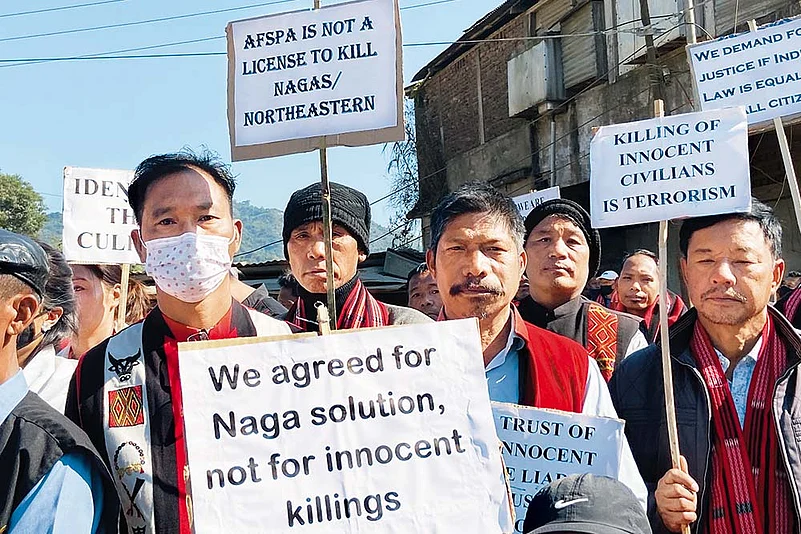 Keapwang Konyak, 31, the president of the student union in Oting village, had gone to his village on December 3 to attend the funeral of his neighbour who had died of natural causes. On December 4, he went down to Tiru to spend time with his friends. They heard the gunshots at around 4:30 pm as they were preparing to return to Oting for the Sunday mass the next day. At the time, Keapwang thought it was a gunfight between insurgents and the army. And at about 6:30, he left Tiru. They were diverted by the army and were asked to take another route. “Nobody in the village has anything to do with insurgency,” he says. “But AFSPA is creating terrorists.”