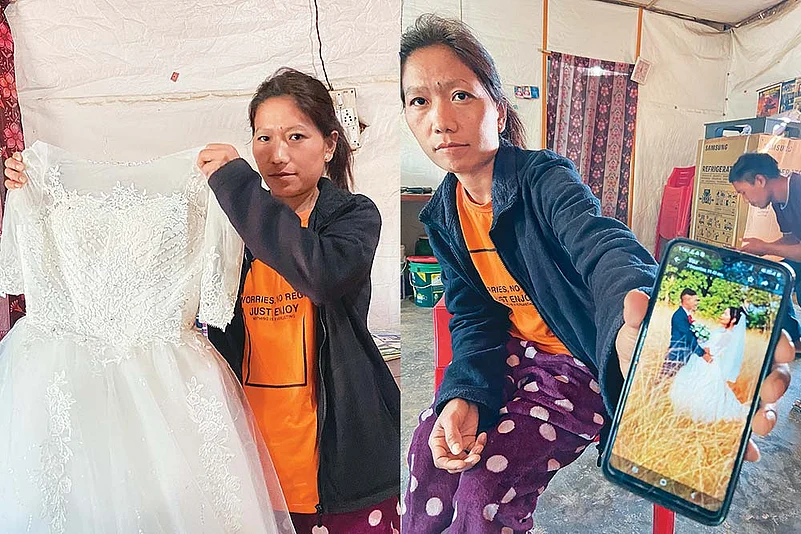 Her fingers, long and steady, go up and down the screen. Monlong, 35, holds the phone steady in one hand and sometimes, her fingers pause, join and then two of them begin a journey of separation and in that ritual, a photo is enlarged. It is from her wedding. She is in a white dress studded with pearls and crystals. He is in a black suit. They are in a field, their backs to each other. In another, they are facing each other. A typical wedding photoshoot. All that remains of those vows of being together as man and wife is a bunch of wedding photos, a lot of uncertainty and a void. They were married on November 25 in the church adjacent to her living quarters. Her wedding gown was bought in Dimapur. So was Hokup’s suit. Now, the wedding suit is hung at the grave. Her ensemble is packed away in a trunk. She brings it out, unfolds it, smoothens the crease and says she liked the way it fell. Like an umbrella around her waist.