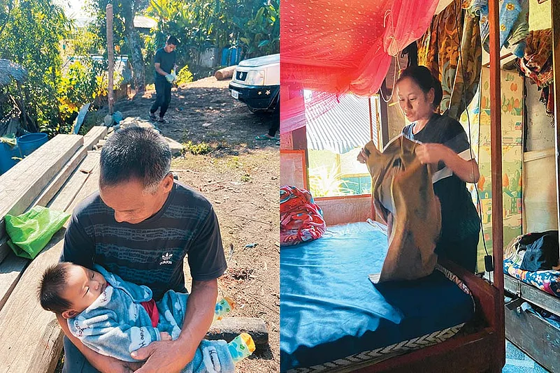 The pink mosquito net has a rose attached to a string. A pink rose made of cloth. Two windows on two walls and a square plastic sheet for the baby on the bed. A world in its own right. This was their room. There’s a wooden box in her room next to the door. Ngamlem, 30, takes out a brown wool peacoat and lays it out the bed. It is a gift. For Christmas. Langtun, 37, is no more. He probably bought it from one of those shops in Mon’s Christmas market where they sell second-hand coats and jumpers. She moves her hand across the lapel to iron out the creases. They were married last September. There was no white wedding. He had fallen in love in Tiru, where she comes from. There will be no Christmas celebrations this year. In the other room in this old house, there is a framed poster. It says Rejoice in the Lord. She looks at it and then walks out of the door. The child is sleeping in her father-in-law’s lap.