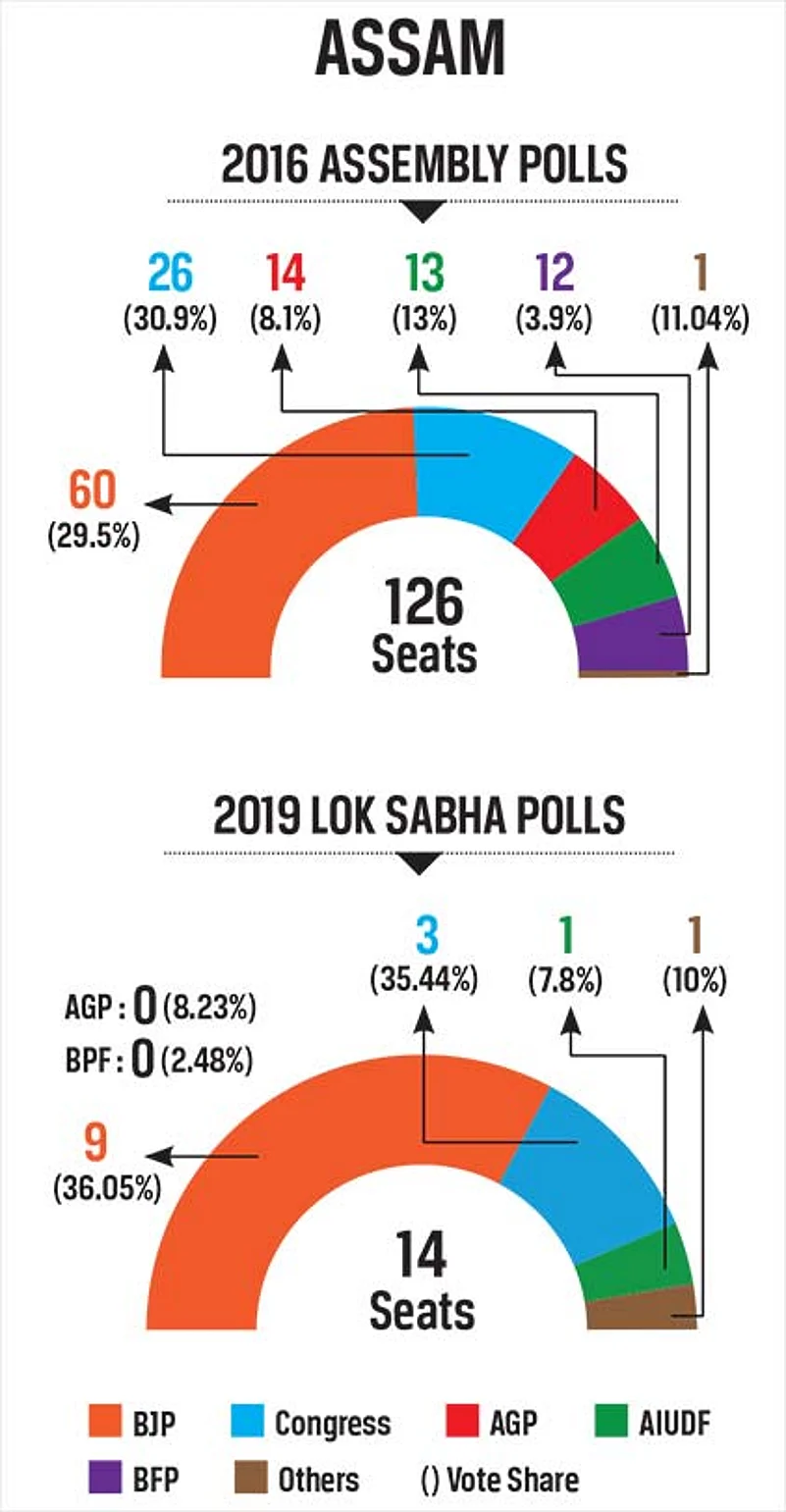 Curious things happen in politics—stranger than leaders switching sides to embrace ideologically opposite parties. But Golaghat constituency in Assam presents a picture bordering on the bizarre. MLA Ajanta Neog is the BJP candidate for the seat and she is up against a familiar foe, Bitopan Saikia of the Congress. That is not the story. In 2016, Neog was the Congress candidate and Saikia was with the BJP. Neog joined the BJP recently and was named the Golaghat candidate. A miffed Saikia found a new home in the Congress. Golaghat is a sub-plot in the unfolding theatre in Assam—Elections 2021. But it gives an idea about the political churning: the ruling BJP is luring ‘winnable’ leaders while opposition parties are hedging their bet on ‘discards’. Even that is not the entire story. Five years after winning Assam—a traditional Congress stronghold—for the first time, the BJP is facing a bigger challenge than it would admit. The Congress-led alliance of eight parties, including the All India United Democratic Front (AIUDF), actually fancies its chances of wresting power on May 2, when votes will be counted. Elections to the 126-member assembly will be held in three phases—March 27 and April 1 and 6.