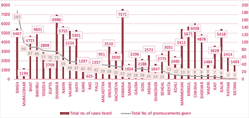 It was found that judges who heard a large number of cases did not always pronounce more judgments. This variance could be a result of judges simply not authoring judgments or their resistance to hear complex cases that require judgments to be pronounced. Alternatively, judges could be inclined to dispose cases through interim orders or the rosters themselves could be poorly and unequally organised. Finally, given limited data available, the methodology might leave some judgments, such as daily orders, from being included in the data-set.