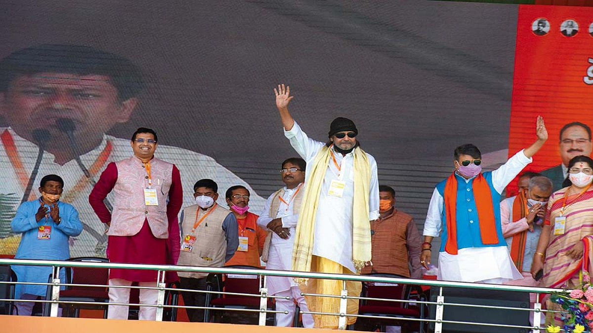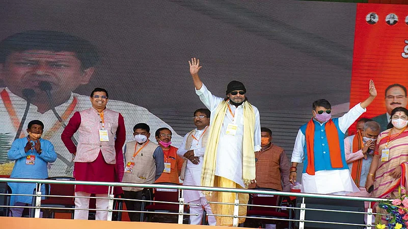 Place: Calcutta’s Brigade Parade Ground, known for its amphitheatrical ethos, with a tradition of mighty political grandstanding, on March 7. Dramatis personae: PM Narendra Modi, other top BJP leaders and Mithun Chakraborty. Audience: Tens of thousands of BJP supporters. “I know you are waiting to hear that dialogue from me…maarbo ekhaney, lash porbey shmashaney (I’ll hit you here and you’ll land in the burning ghat)…that will continue, but I am giving you a new one now,” Mithun Chakraborty said. “Do remember this dialogue,” he continued after a pause. “I am summing up all that the senior leaders said so long…and the dialogue reflects me, Mithun Chakraborty. I do what I say. Ami Joldhora-o Noi, Balibora-o noi, ami jaat gokhro. Ek chhobolei chhobi. Hya, ebar etai hobe Banglay.” That bloodcurdling line means, “I am neither Joldhora nor Balibora (non-venomous snakes); I am the real cobra. Just one bite and you’ll become a photograph. Yes, that’s what going to happen in Bengal this time.” The crowd burst into wild cheers. The presence of the ever-popular Mithun—clad in the traditional Bengali attire of dhuti-panjabi (kurta)—in the high-profile rally was touted as its prime attraction.