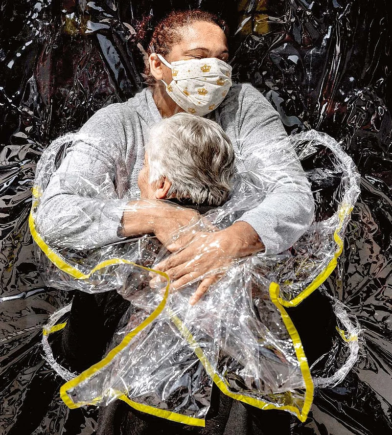 This photo symbolizing “love and compassion” of an 85-year-old Brazilian woman getting her first embrace in five months from a nurse through a transparent “hug curtain” is the World Press Photo of the Year.