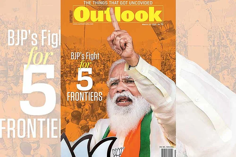 And no surprises, he will do the honours on the frontline: Modi is both the advertisement and the product. Over 20 Modi rallies are scheduled in West Bengal alone over its eight-phase election, and half-a-dozen in Assam. Union home minister Amit Shah and president J.P. Nadda are likely to address 50 rallies each, other senior leaders, Union ministers and CMs will do duty too. “The prime minister remains our campaigner-in-chief. His presence works wonders for the party. His rallies and those by Amit Shah will ensure a conducive atmosphere for the party,” says Rahul Sinha, senior BJP leader and former state president of West Bengal.