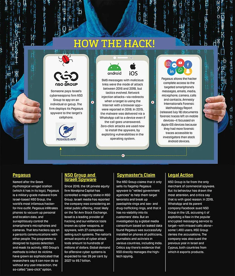 What started with WhatsApp revealing that around 1,400 of its users in 20 countries, including Indian journalists and activists, had been targeted by Pegasus—the spyware developed and sold to governments by Israel-based NSO Group—in May 2019 has now assumed much wider proportions with news that Pegasus may have been used to hack the phones of as many as 300 Indian citizens. The list of potential targets includes Union ministers, politicians from both ruling and opposition parties, judges, activists, journalists and NGOs—from Congress leader Rahul Gandhi to election strategist Prashant Kishor, former election commissioner Ashok Lavasa and a woman who accused a former Chief Justice of India of sexual harassment. The modus operandi involves infiltrating phones to monitor text messages, camera feeds and microphones, without leaving any evidence in the device. The allegedly targeted phone numbers are part of a leaked database accessed by Forbidden Stories, a French media non-profit, and shared with an international media consortium. The controversy rocked the ongoing monsoon session of Parliament, with opposition parties up in arms against the Narendra Modi government.