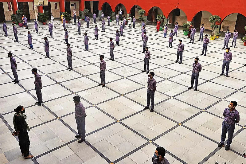 It’s 8. 30 in the morning, and the scene inside the GLT Saraswati Bal Mandir School is a world removed from the bustling traffic just outside—a narrow street in South Delhi’s Nehru Nagar. An air of tranquility rests over the morning assembly in the courtyard. A young student lights a lamp in front of three garlanded photographs—Goddess Saraswati, the symbol ‘Om’ and Bharat Mata—murmuring a prayer. Hands clasped, around 100 students standing in lines follow suit, as Vedic chants play loudly in the background.