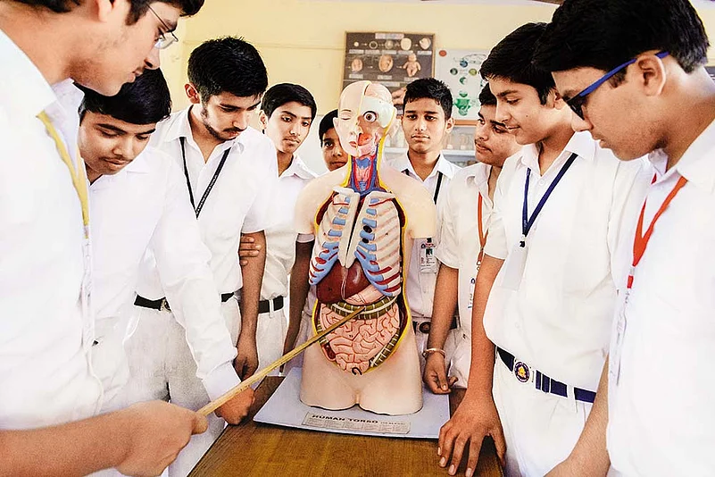 Set up in 1971, the school now has 2,000 students, says Mishra, insisting that the ideology of its parent organisation doesn’t come in the way of its functioning. “We are a normal school like any other. It is a matter of pride that our thrust is on Indian culture and values,” she says. On the walls of the three-storeyed building are emblazoned teachings and photographs of RSS ideologues K.B. Hedgewar and M.S. Golwalkar. Idols of goddess Saraswati in various hues can be spotted around corners and in the courtyard. The many paintings on the inner walls depict scenes from the Mahabharata and Ramayana. A board outside a classroom announces a prayer schedule: Tuesdays, Hanuman Chalisa; Wednesdays, patriotic songs; Thursdays, Ramayana and on Fridays hymns from the Bhagavad Gita.