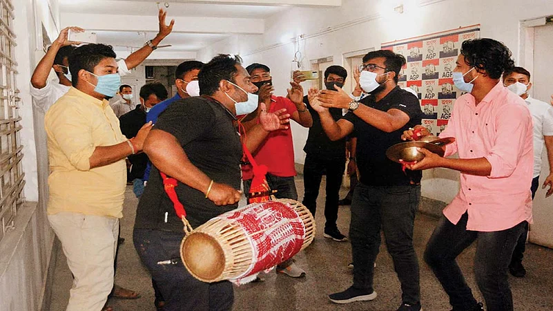 It could have tumbled further. What stanched that possible blood loss was a crucial split of votes between the Congress-led front and the AJP-RD alliance. Analysis shows the fragmenting of anti-NDA votes helped the ruling alliance retain 10-plus seats in upper and central Assam, even with lower margins. The Congress-led alliance won in 50 constituencies, and the APJ-RD won only one seat—that was accomplished by the charismatic RD chief and peasant leader Akhil Gogoi, who’s still imprisoned for his role in the anti-CAA stir. The AJP, which evolved out of the old AASU stock, drew a blank.