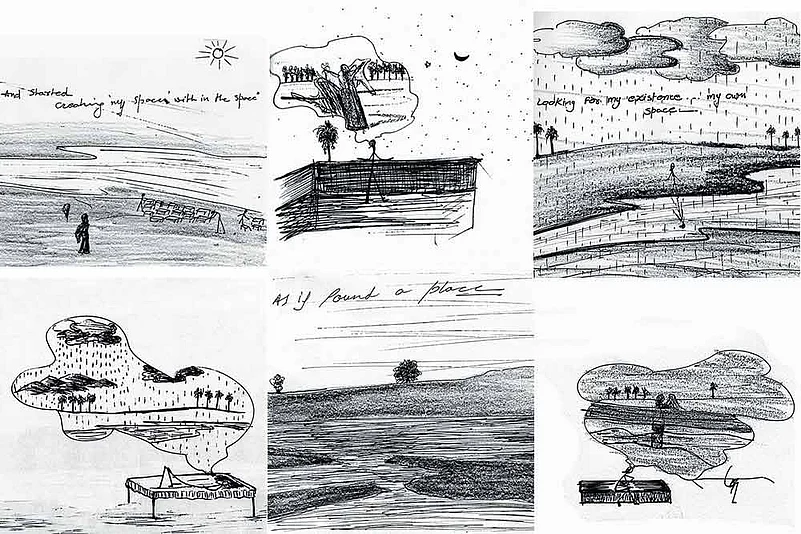 Vibha Galhotra is a delhi-based conceptual artist. These drawings from ‘space within the space’ were part of a larger body of work staged in santiniketan in 2000 and present the inception of the work in a visual diary.