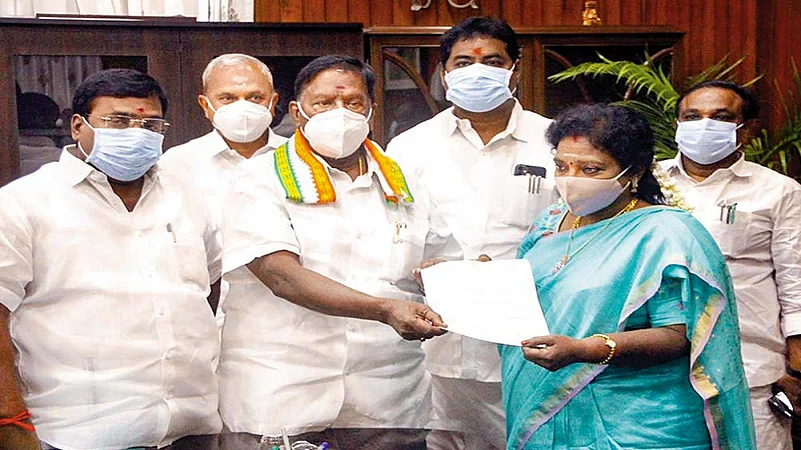 The only Congress government in the South—led by V. Narayanasamy in Pondicherry—sputtered and collapsed in slow motion a few weeks before the Union territory was to elect its next assembly. The symptoms were there for everyone to witness—defection of two MLAs followed by a couple of more resignations just before Rahul Gandhi arrived on a visit, and two more resignations ahead of the trust vote in the assembly. And yet the Congress leadership failed to take any defensive action to stem the rot, allowing the Narayanasamy government to be undermined from within, with a helpful nudge from the BJP.