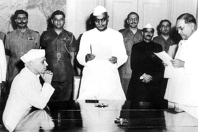 B.R. Ambedkar being sworn in Union law minister in Nehru’s cabinet