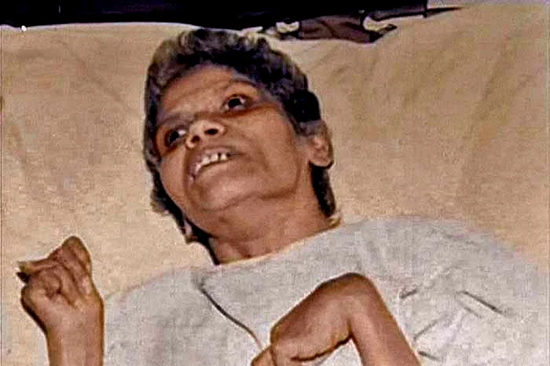 Aruna Shanbaug. Sodomised. Strangled with a dog-chain while being brutalised. Extensive brain stem injury, partially brain-dead. Cortically blind. Cannot speak. Or walk. No control over body movements. Administered mashed food, swallows automatically, upchucks equally. Teeth loosening and falling—one by one—on her bed. In pain. Shrieking. Howling. Weeping. Laughing manically. After the initial days, no medicines prescribed by the doctors, so none given.