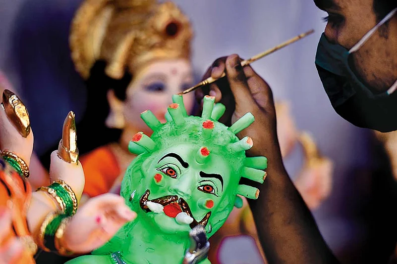 Spiky Covid is inescapable from the idol being made at Lalbaug in Mumbai.