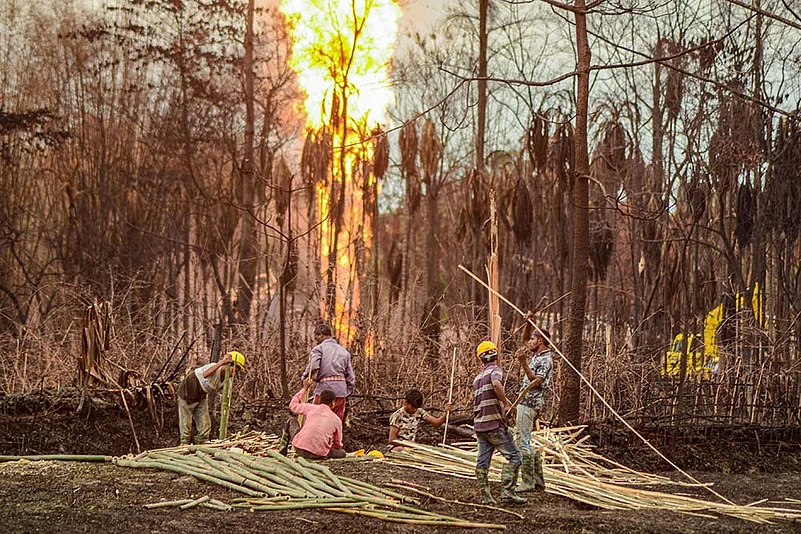 Moromi is still numb after witnessing the conflagration engulf the area. “Seeing such a huge fire, the village was in shock. Panic-stricken, we rushed for safer places. I have never been in such a situation,” she tells Outlook over the phone. “Our house is safe but we lost two goats,” adds Moromi, whose father is a fisherman. Her immediate concern now is about the safety and viability of her father’s job. Moromi has read the portent well—she recalls seeing scores of fish die in nearby water bodies. “I don’t know what will happen to our family. I don’t even know when we will be able to go back,” she says dejectedly.